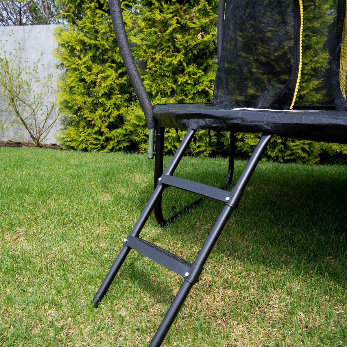 Лестница оборудована пластиковыми ступенями, что предотвращает скольжение. Батут легко собирается и разбирается, что позволяет быстро установить его на дачном участке или игровой детской площадке, делает удобным для хранения и транспортировки.