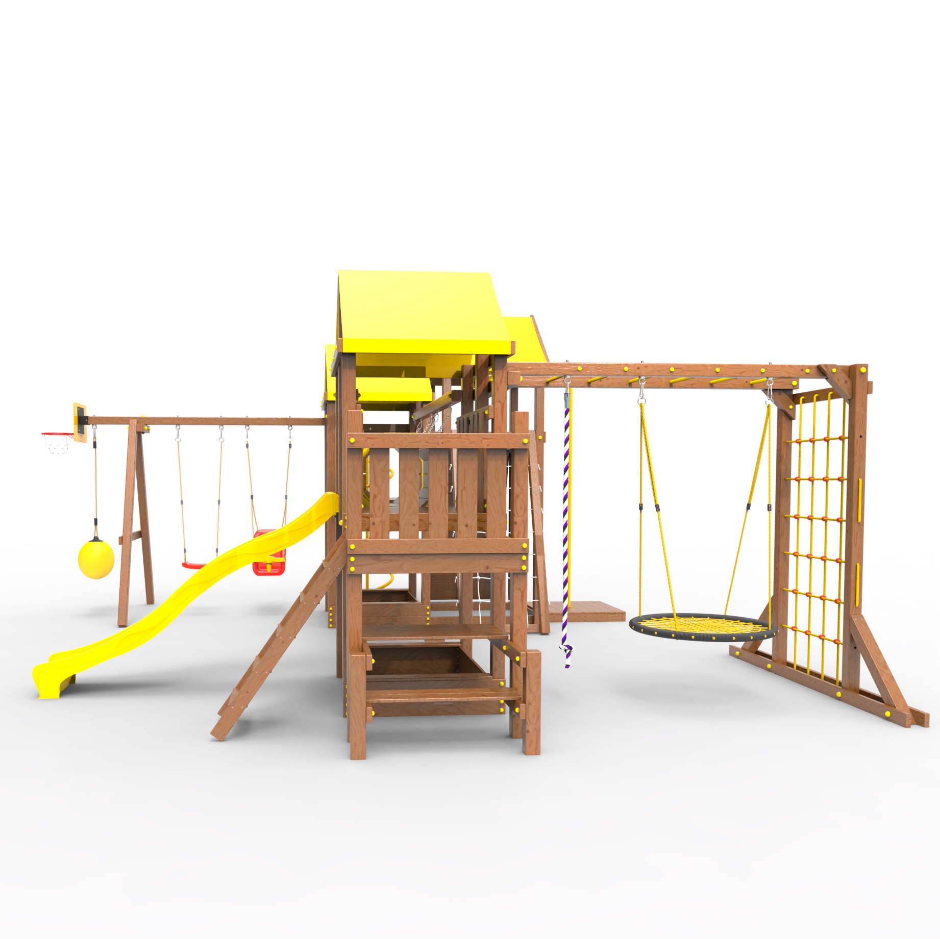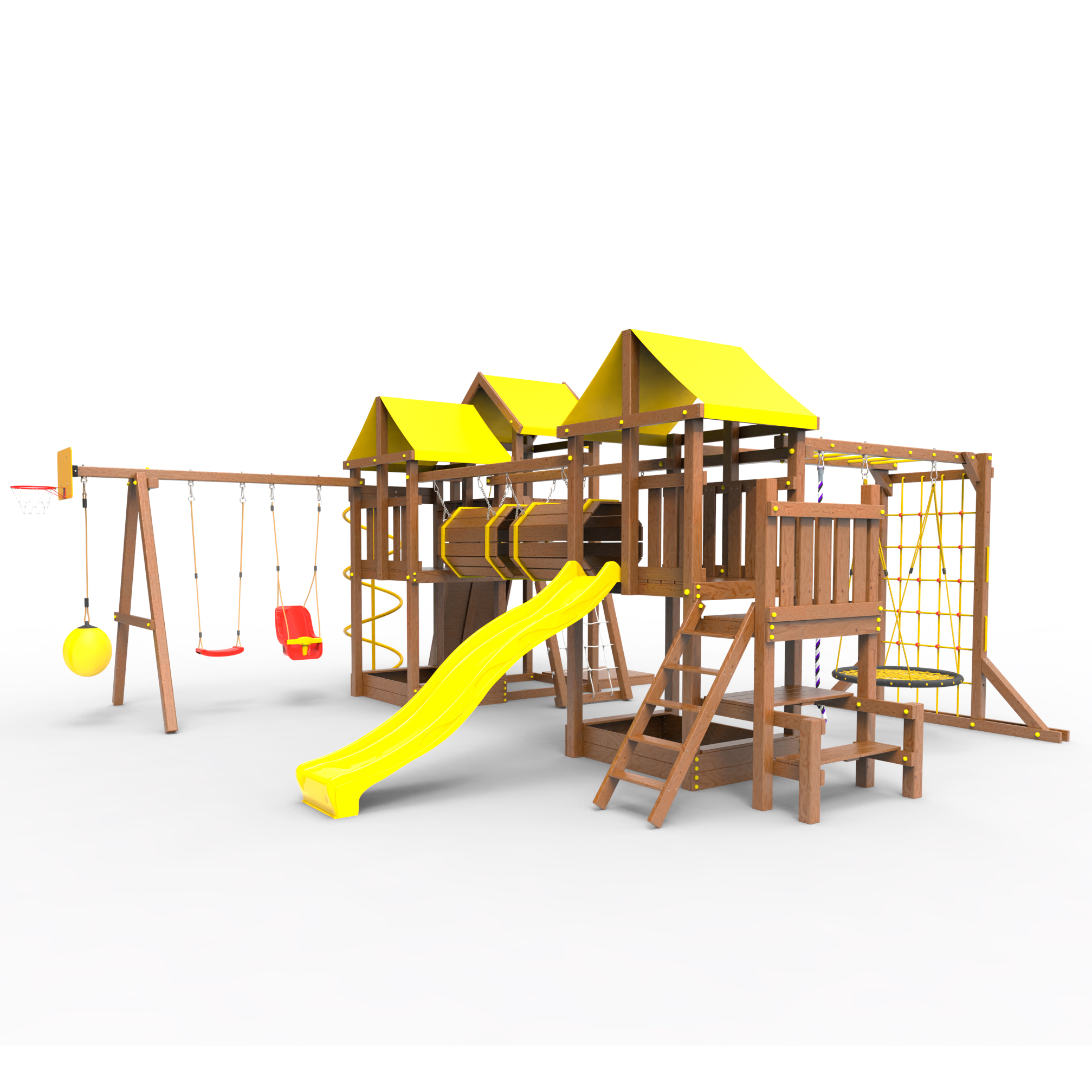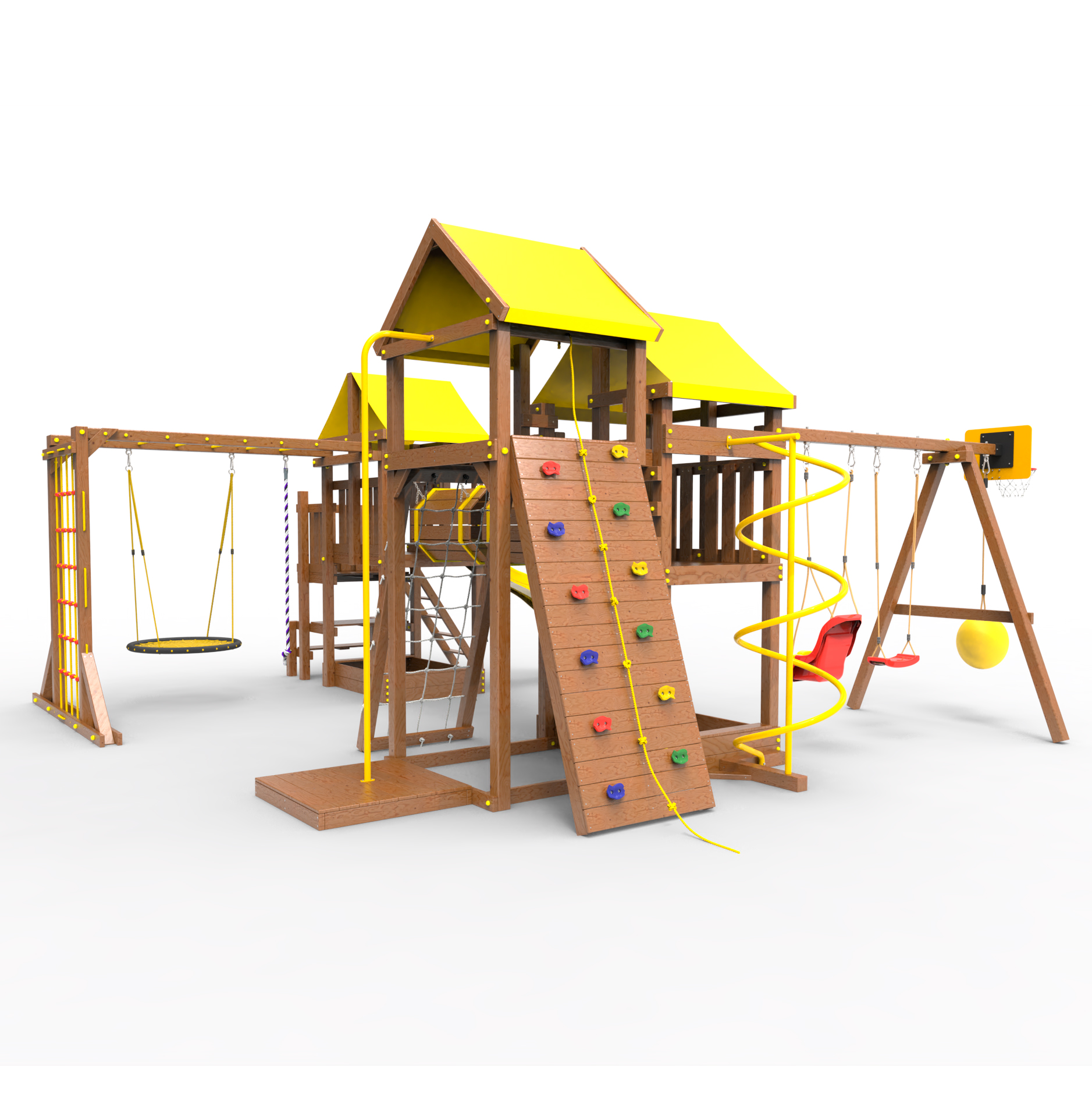Два домика|Песочница|Лестница|Шторм-трап|Скалодром|Рукоход|Шведская стенка|Турник|Руфер|Баскетбольная корзина|Мостик|Горка|Спираль|Волна|Сеть для лазания|Качели |