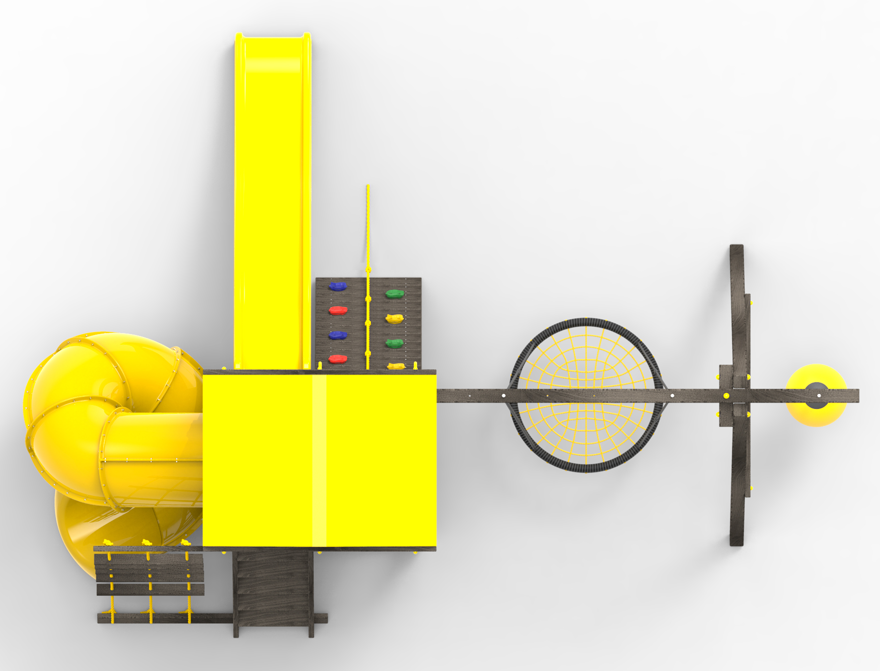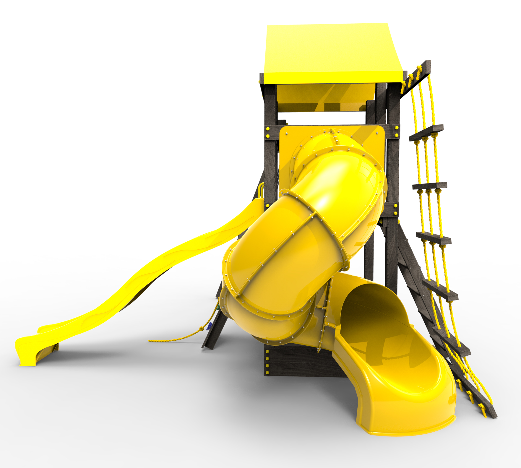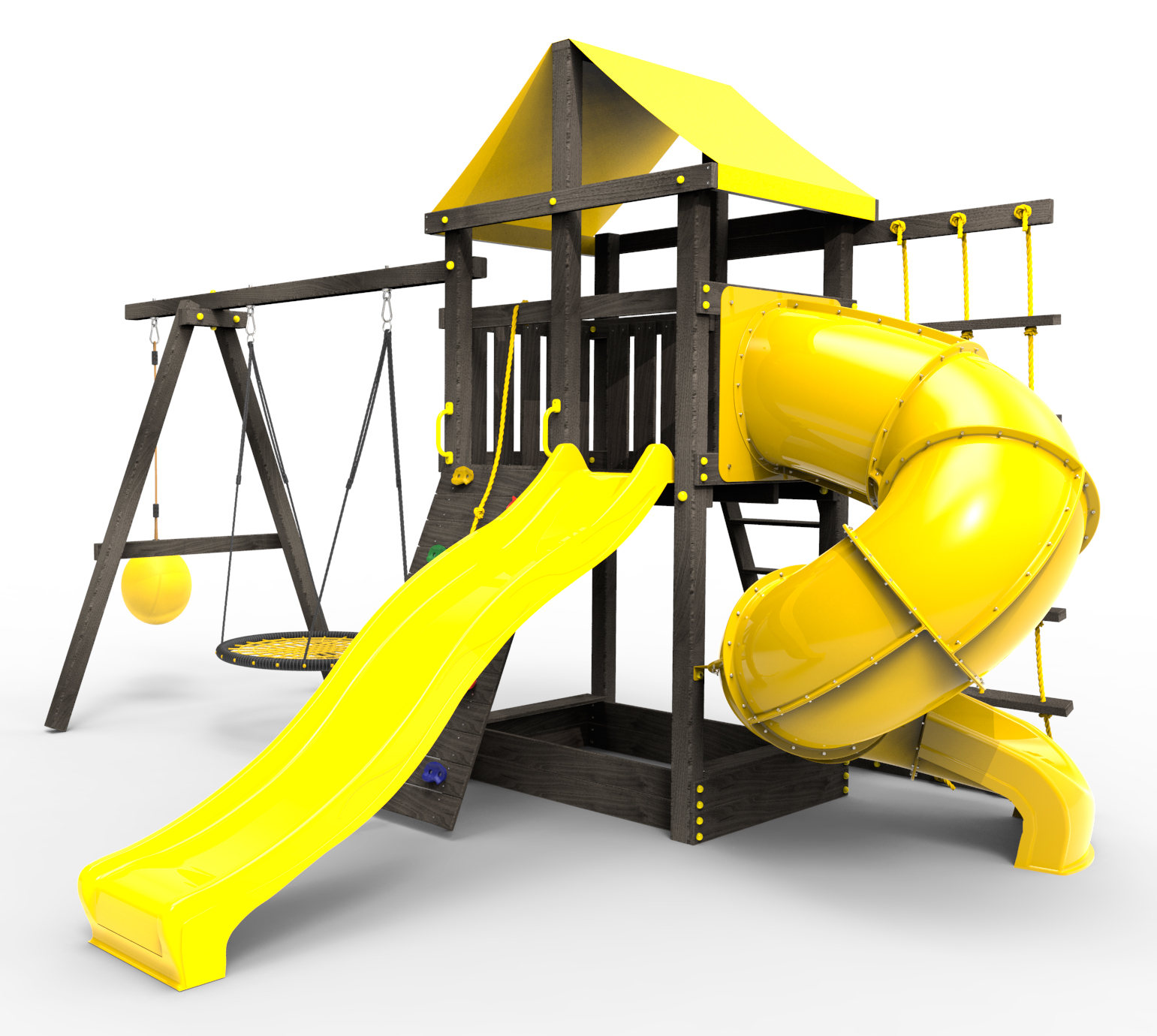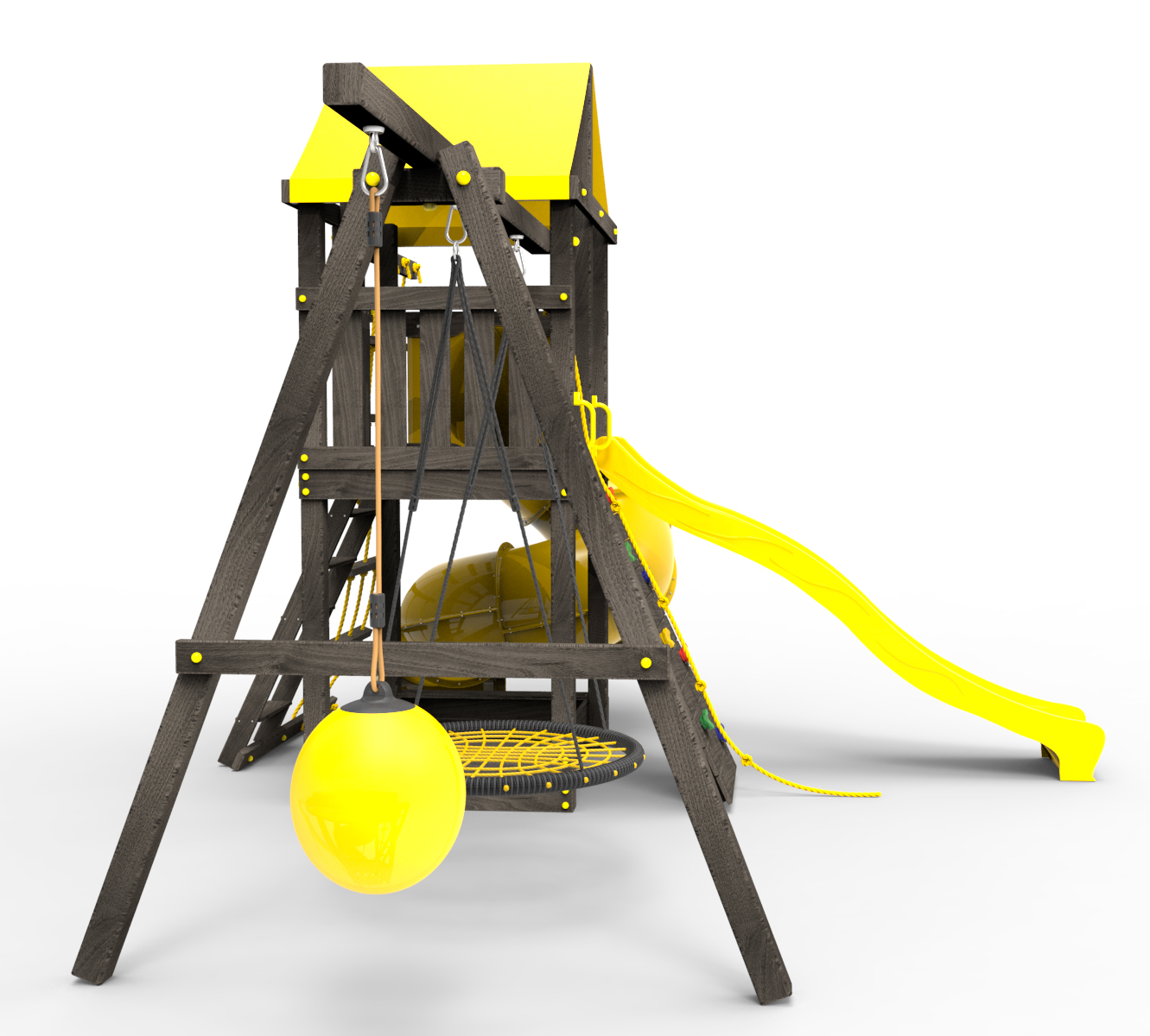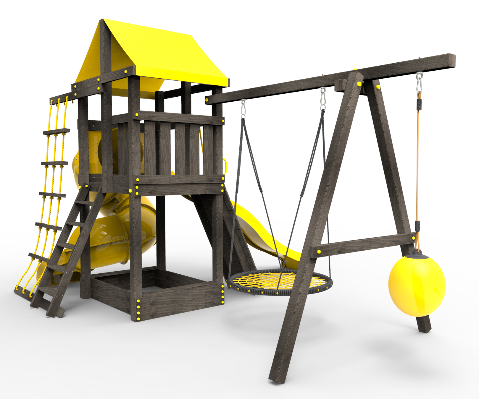 Детская площадка «Пикник Black » представляет собой двухуровневую конструкцию, на первом уровне которой расположена песочница, а второй этаж представляет собой игровое пространство под деревянной крышей. Конструкция оснащена качельной балкой, повышенной прочности, которая имеет 5 креплений для качелей или любого другого навесного оборудования, шторм-трапом ,горкой и скалодромом! .