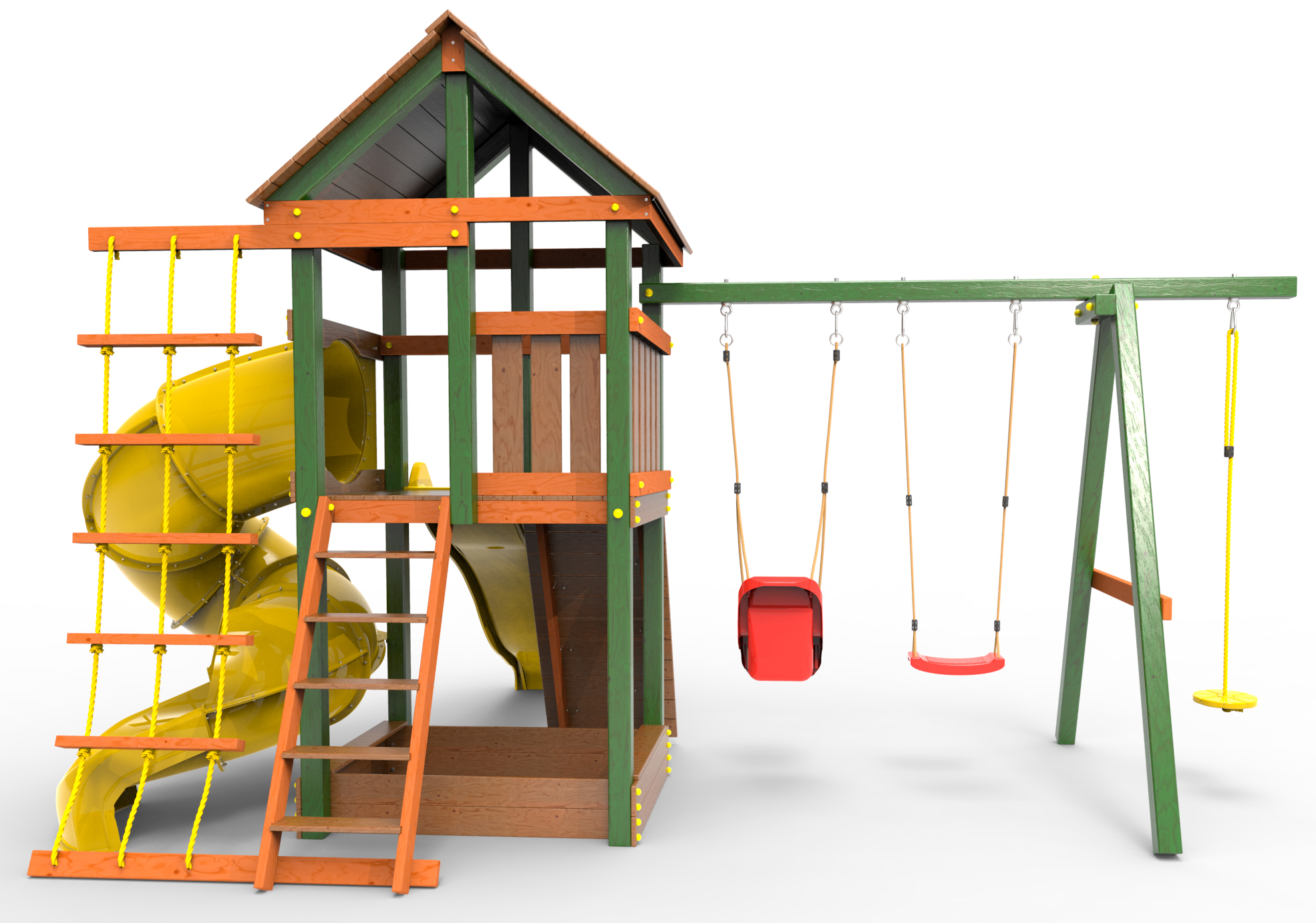 Детская площадка «Пикник Вега » представляет собой двухуровневую конструкцию, на первом уровне которой расположена песочница, а второй этаж представляет собой игровое пространство под деревянной крышей. Конструкция оснащена качельной балкой, повышенной прочности, которая имеет 5 креплений для качелей или любого другого навесного оборудования, шторм-трапом , двумя горками и скалодромом! .
