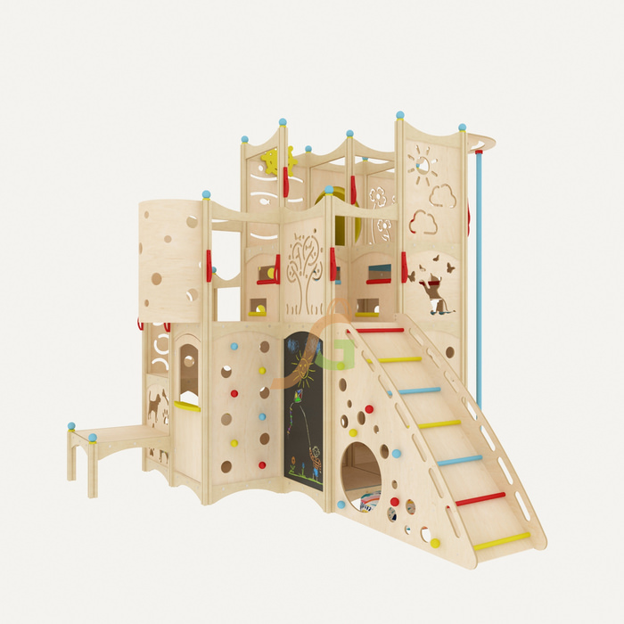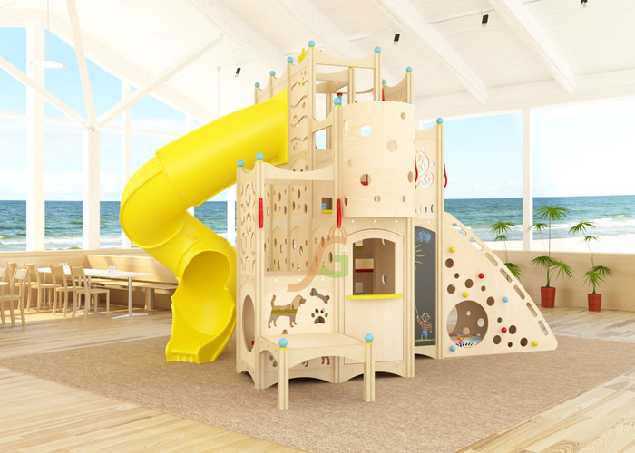 Представленная конструкция оснащена не только спортивными модулями (горкой-трубой, скалодромом, шестом, лесенкой), но и столиком, который понадобится детишкам для рисования, чаепития;