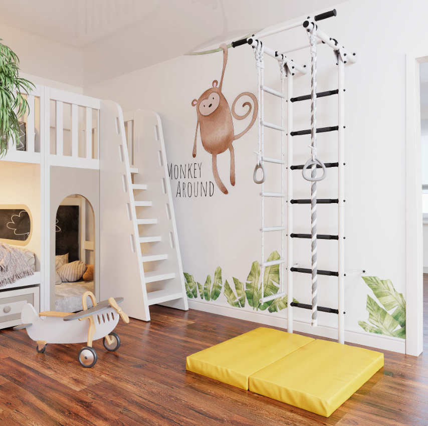 Желтый цвет ступеней гармонично сочетается с белым корпусом, спортивный уголок стильно выглядит в любом интерьере.