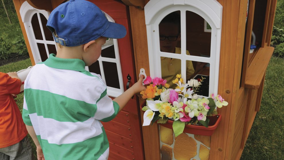 Каменная стена из искусственного камня, дымовая труба, дверь со звонком, большие овальные окна с цветочными горшками и декоративными искусственными цветами, в том числе эркерное окно, обеспечат детей идеальным местом для общения с друзьями.