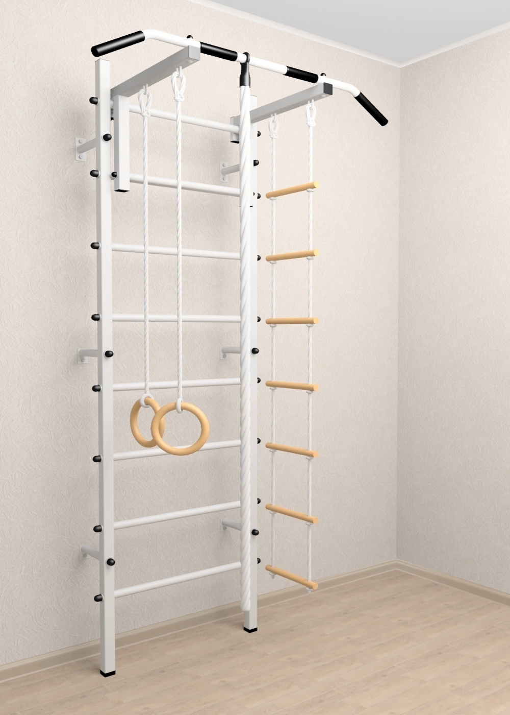 Стойки шведской стенки Sv Sport усиленные изготовлены из профильной трубы 60 х 40 х 2 мм. Ступени изготовлены из круглой, стальной трубы, покрытой резиной (не скользят, не натирают мозоли, не прокручиваются, не имеют запаха, приятны на ощупь). Устанавливается к стене при помощи 6 кронштейнов. На перекладину, в местах хватов, одеты резиновые ручки.