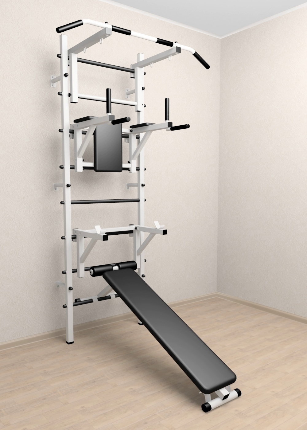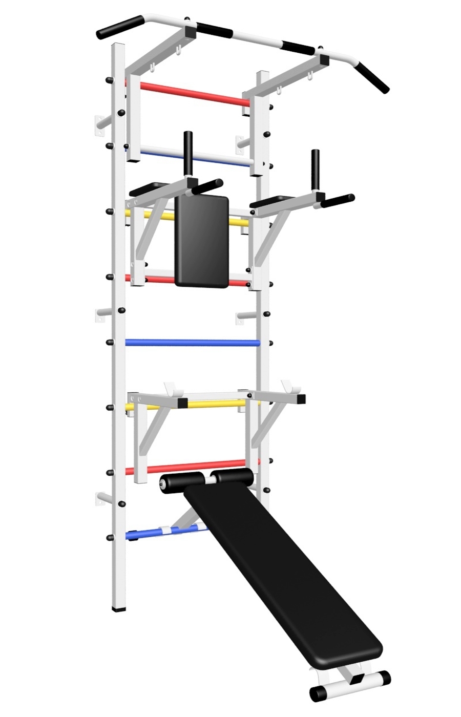 Стойки шведской стенки Sv Sport усиленные изготовлены из профильной трубы 60 х 40 х 2 мм. Ступени изготовлены из круглой, стальной трубы, покрытой резиной (не скользят, не натирают мозоли, не прокручиваются, не имеют запаха, приятны на ощупь). Устанавливается к стене при помощи 6 кронштейнов. На перекладину, в местах хватов, одеты резиновые ручки.