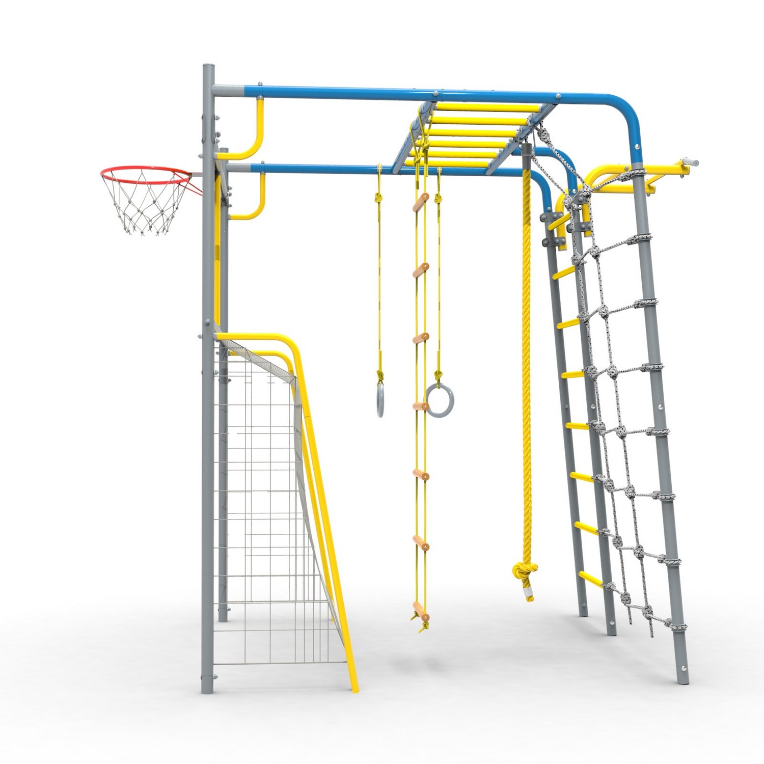 - Комплектация Ворота, сетка для лазания, кольца гимнастические, канат, кольцо баскетбольное, лестница веревочная, турник (регулируемый по высоте), рукоход, ступени ПВХ